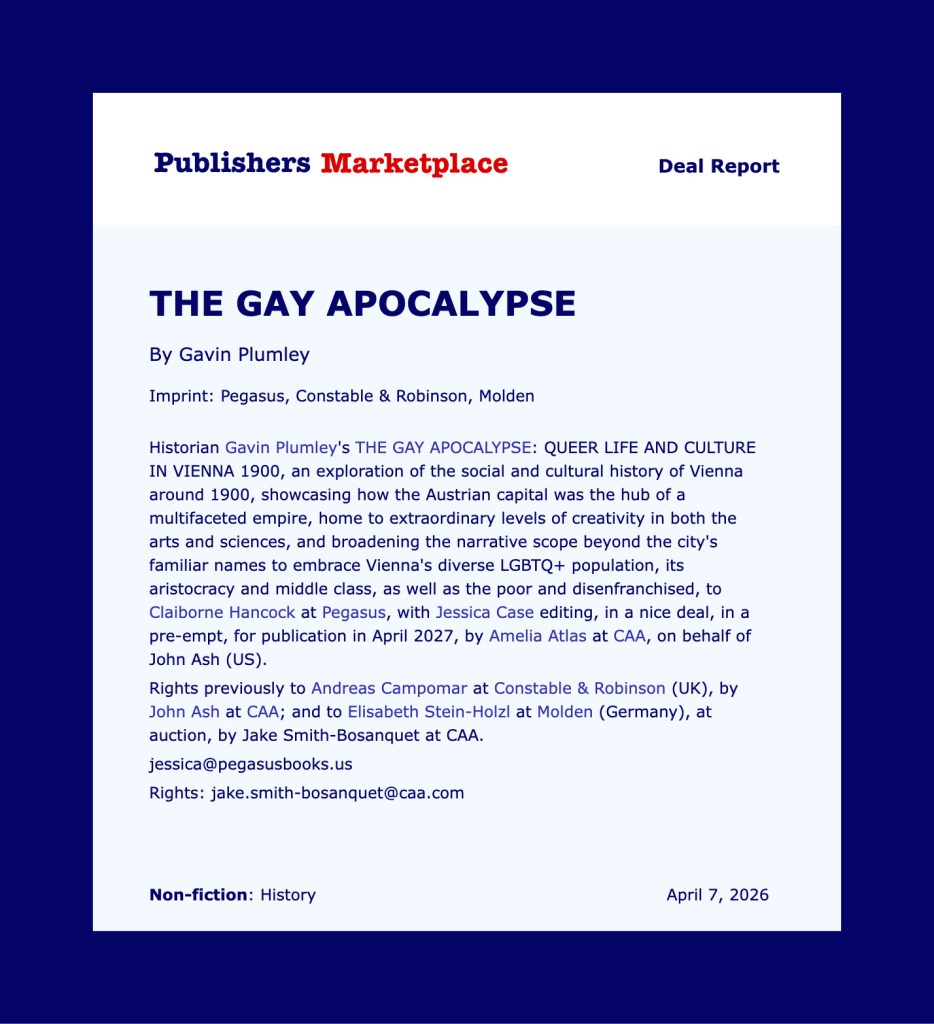 Gavin is currently writing his second book, The Gay Apocalypse: Queer Life and Culture in Vienna 1900. It is due to be published in 2027 in the UK/Commonwealth by Constable (Little, Brown), in the German-speaking world by Molden (Styria Buchverlage) and in the US/Canada by Pegasus Books.